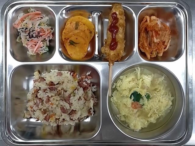 석식 : 오리훈제볶음밥,파계란국,단무지무침,숙주맛살무침,배추김치,콘후레이크핫도그+케찹
