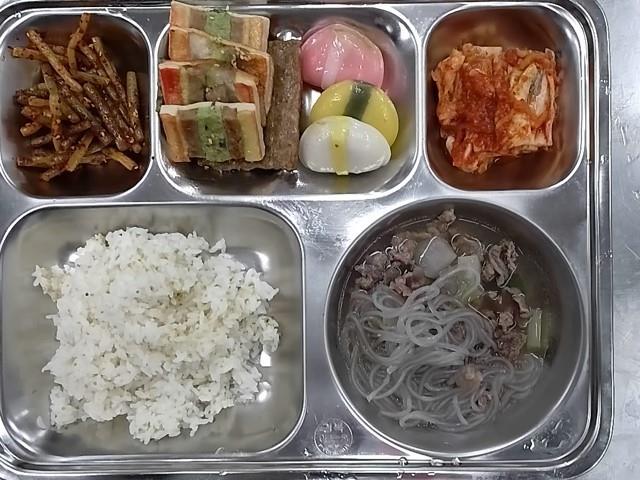 조식 : 차조밥,쇠고기당면국,오색전(명절)+초간장.궁중산적구이,마늘쫑무침,배추김치,반달떡