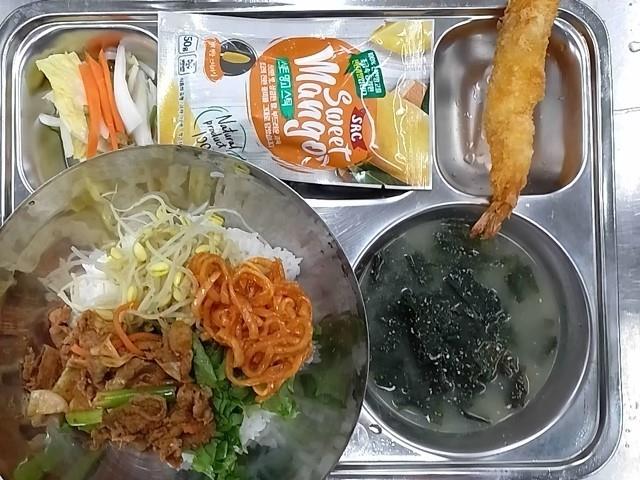 중식 : 돈불고기 비빔밥,들깨미역국,왕새우튀김,백김치,아이스 망고