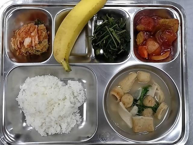 조식 : 백미밥,어묵쑥갓국,고추듬뿍 넣었닭,취나물,배추김치,바나나