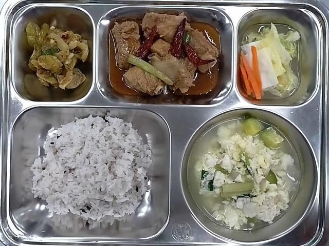 석식 : 혼합10곡밥,순두부달걀국,매운등갈비찜,오이지무침,백김치