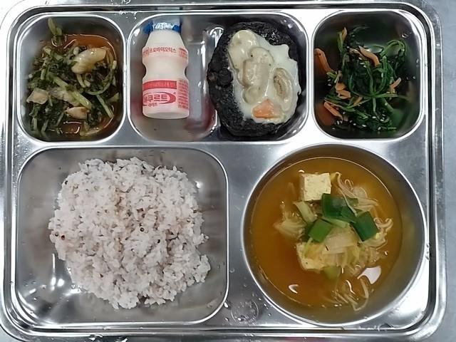 조식 : 차수수밥,김치콩나물국,오징어블랙함박스테이크+까르보나라소스,시금치나물,열무김치,요구르트