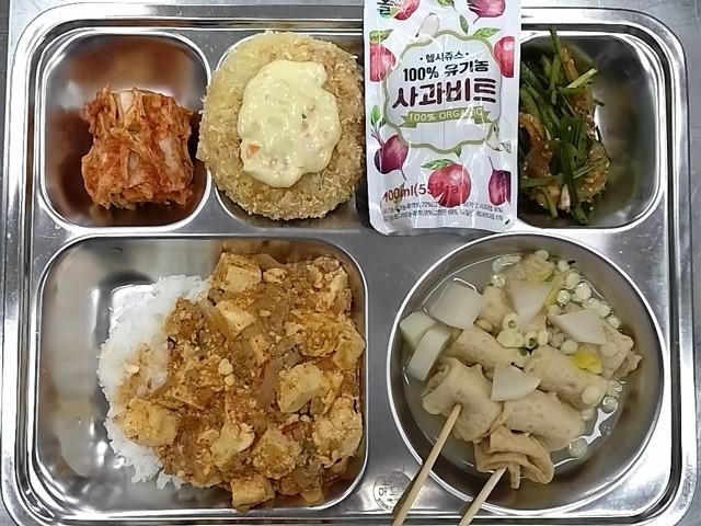 석식 : 마파두부덮밥,어묵꼬치국,꼬꼬닭콘슈레드+소스,오이양파무침,배추김치,유기농 사과비트주스