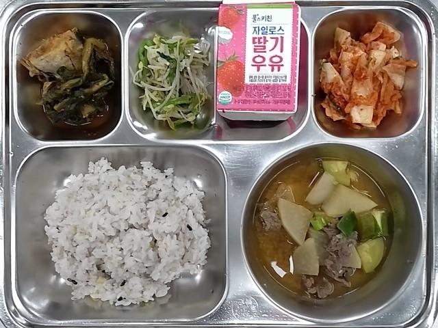 조식 : 혼합잡곡밥,소고기된장찌개,코다리무청조림,숙주미나리무침,배추김치,딸기우유