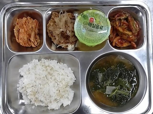 석식 : 찰보리밥,건새우아욱된장국,돈꼬노미야끼,오이양파무침,배추김치,매실주스