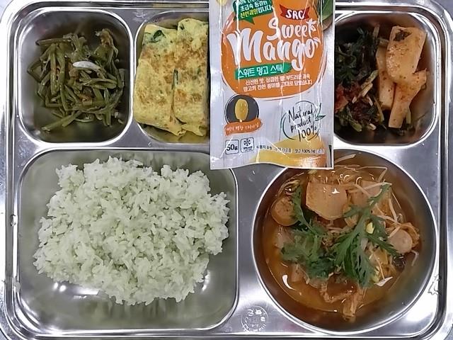중식 : 클로렐라밥,부대찌개,시금치계란말이,고구마줄기볶음,총각김치,파김치,아이스망고