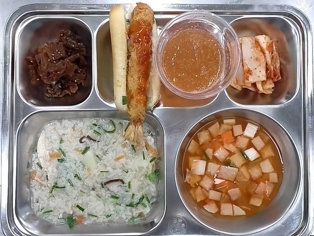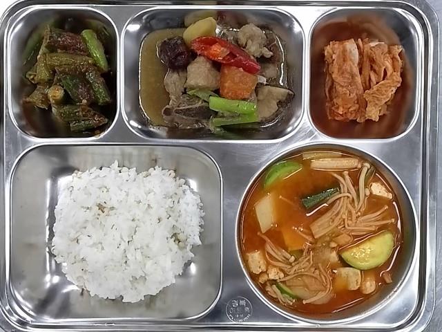 석식 : 율무밥,감자고추장찌개,돼지갈비찜,아삭이고추된장무침,배추김치