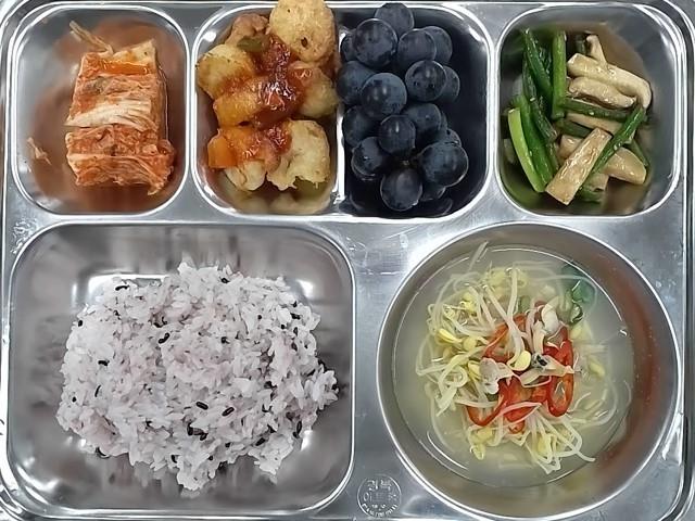 조식 : 기장흑미밥,조갯살콩나물국,파슬리깐쇼새우강정,새송이마늘쫑볶음,배추김치,친환경 포도