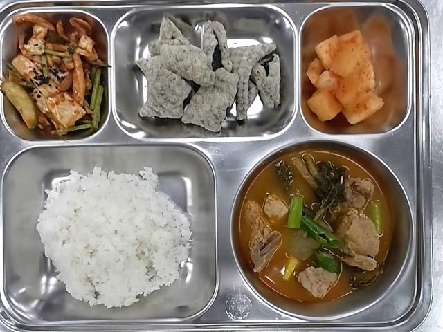 석식 : 백미밥,우거지갈비탕,오징어야채무침,찹쌀김부각,깍두기