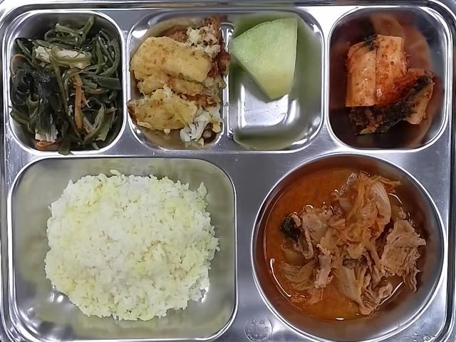 중식 : 강황밥,김치짜글이,가자미카레구이,미역줄기맛살볶음,총각김치,조각메론