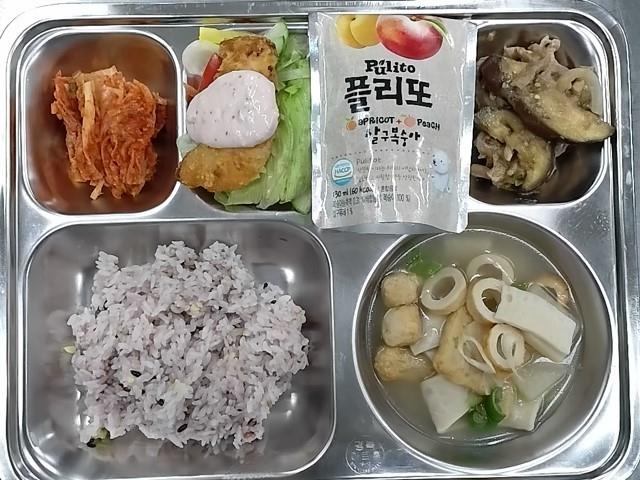 조식 : 혼합잡곡밥,어묵쑥갓무국,어향가지볶음,치킨텐더샐러드,배추김치,살구복숭아주스