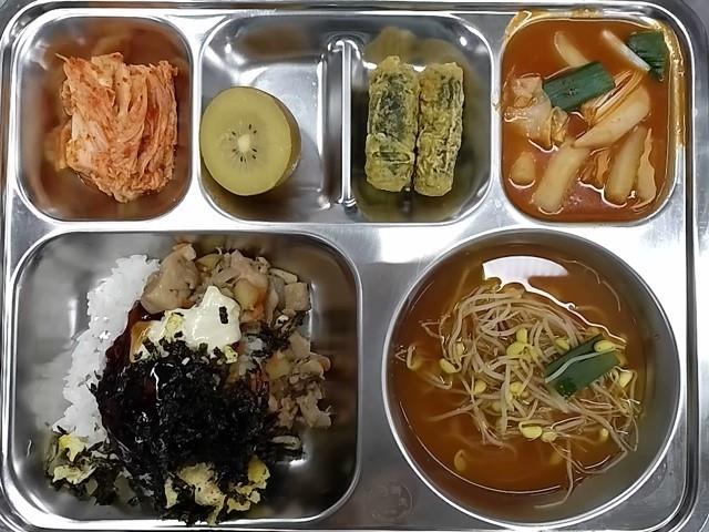 중식 : 치킨마요덮밥,매운콩나물국,야채떡볶이,김말이,배추김치,골드키위