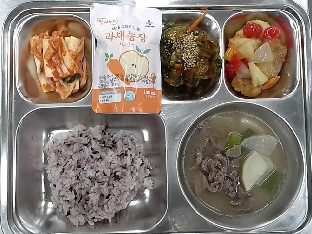 조식 : 찰흑미밥,소고기무국,후르츠찹쌀탕수육,오이생채,배추김치,사과당근주스