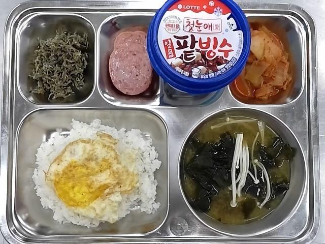 중식 : 옛날도시락 셋트(멸치볶음,햄전,김치볶음,계란후라이),미역된장국, 팥빙수
