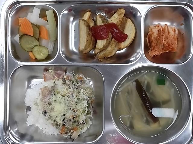 석식 : 버섯크림미소리조또,건새우무다시마국,감자튀김+케찹,삼색모듬피클,배추김치