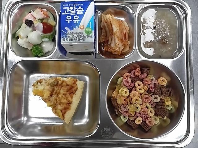 조식 : 피자빵,숭늉,맛살메추리알샐러드,시리얼+우유,배추김치