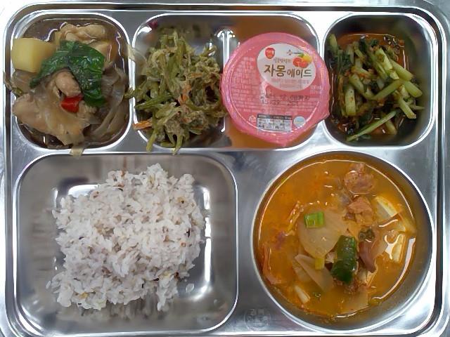 석식 : 혼합10곡밥,부대찌개,안동찜닭,고구마줄기볶음,열무김치,자몽에이드