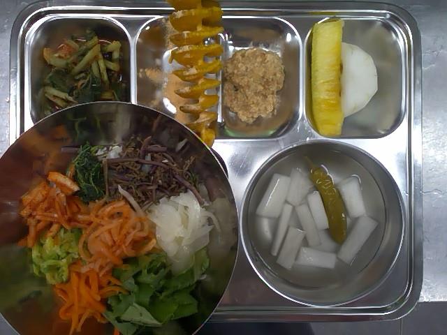 중식 : 강된장산채비빔밥,동치미,회오리감자튀김,열무김치,파인애플(조각),참외