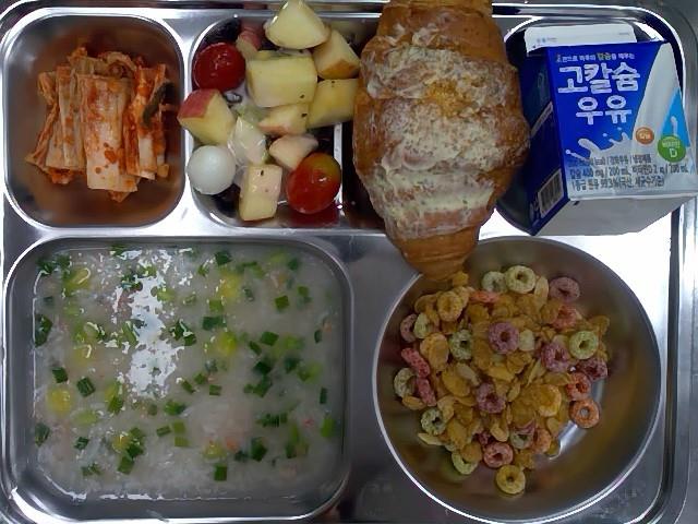 조식 : 영양게살죽,갈릭크로와상,과일샐러드,배추김치,시리얼+우유