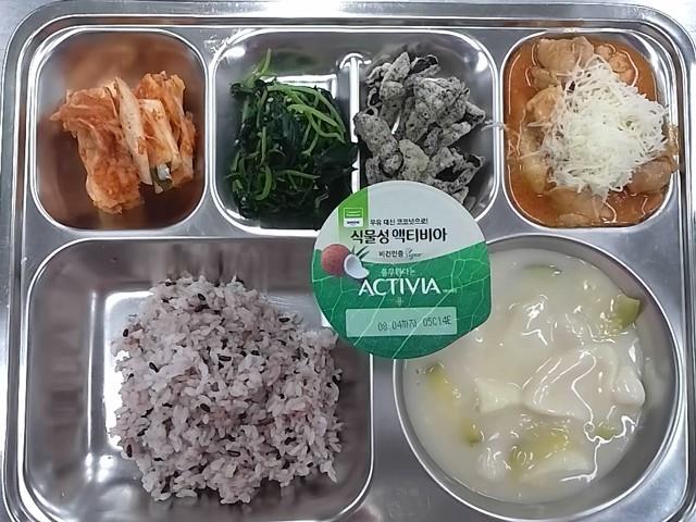 석식 : 기장흑미밥,감자수제비국,눈꽃치즈불닭,참나물무침,찹쌀김부각,배추김치,식물성액티비아(복숭아)