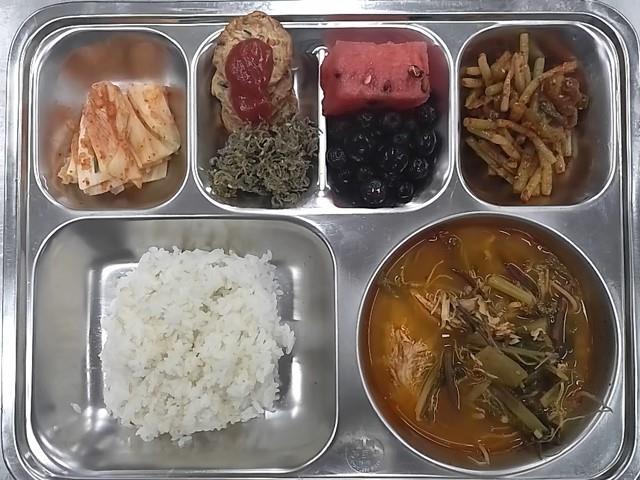 조식 : 현미밥,닭개장,해물동그랑땡+케찹,마늘쫑오이지무침,가이리멸치볶음,배추김치,친환경블루베리,수박