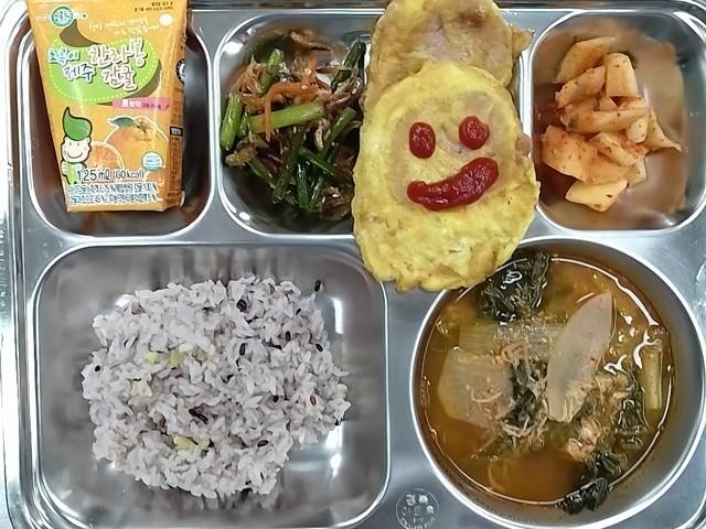 조식 : 혼합잡곡밥,닭배추국,스팸햄+케찹,건새우마늘쫑볶음,깍두기,제주감귤주스