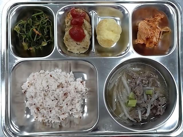 조식 : 차수수밥,소고기무채국,칼슘해물완자전,참나물고추장무침,배추김치,아이스 바바이안슈