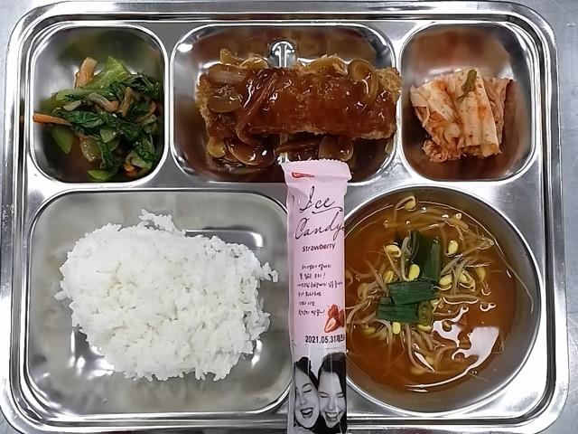 석식 : 백미밥,매운콩나물국,치즈롤돈까스+소스,청경채초장무침,배추김치,아이스크림