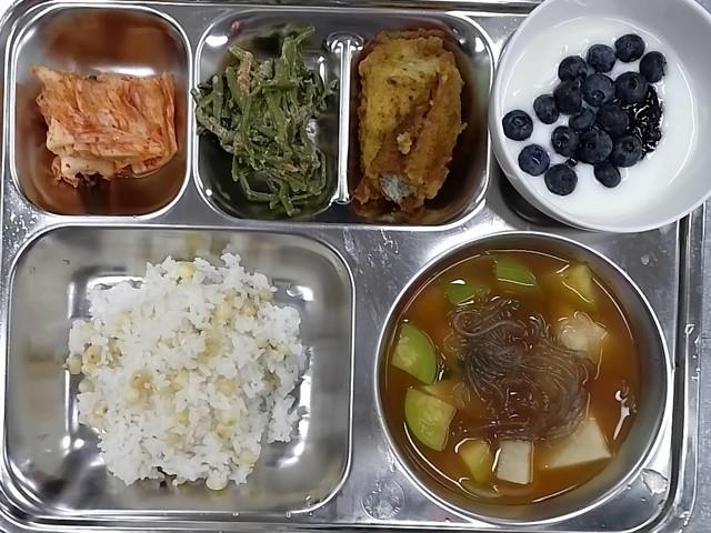 중식 : 찰옥수수밥,감자고추장찌개,가자미카레구이,고구마줄기볶음,배추김치,블루베리수제요거트