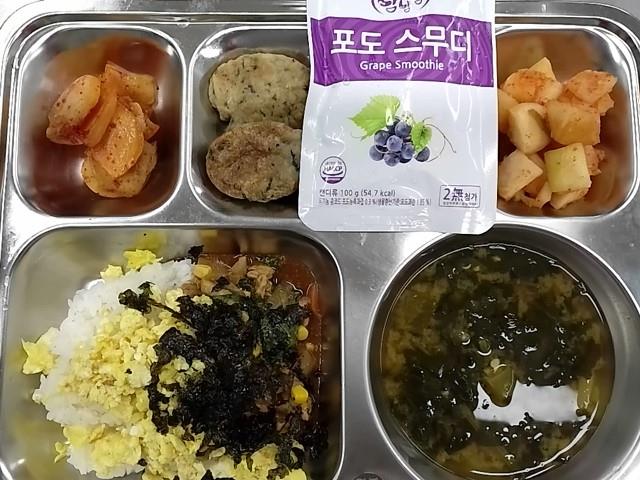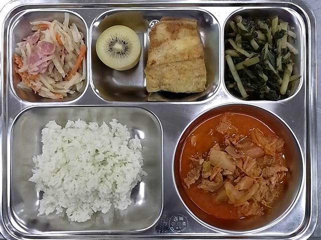 중식 : 클로렐라밥,돈육짜글이,삼치카레구이,감자채베이컨볶음,열무김치,골드키위