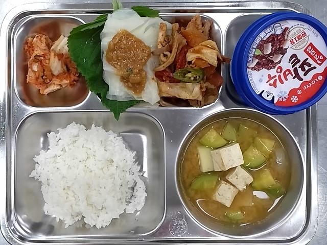석식 : 백미밥,두부된장찌개,오삼불고기,깻잎,양배추찜+쌈장,배추김치,팥빙수