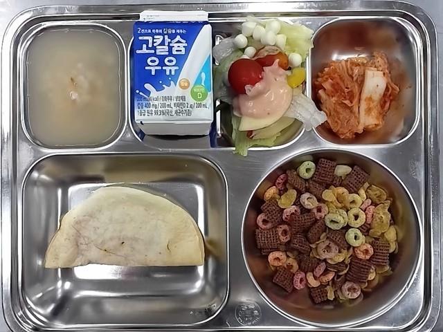조식 : 닭고기반달꿔사디아,숭늉,배추김치,양상추사과샐러드,시리얼+우유
