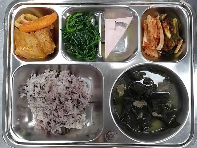 중식 : 기장흑미밥,쇠고기미역국,해물등갈비김치찜,비름나물,배추김치,파김치,요거트치즈케이크