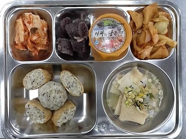 석식 : 유부초밥+주먹밥,어묵무국,국물떡볶이,찰순대,배추김치,캐플주스