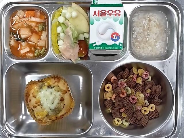 조식 : 불고기&치즈 브래드,숭늉,사과양상추샐러드,나박김치,시리얼+우유