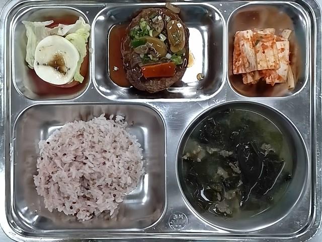 석식 : 차수수밥,쇠고기미역국,꽃갈비스테이크+소스,토마토모짜렐라샐러드,배추김치