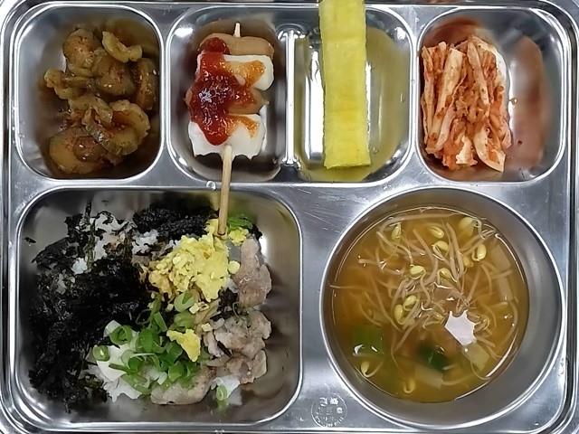 중식 : 치킨마요덮밥,매운콩나물국,오이지무침,소떡소떡구이,배추김치,파인애플
