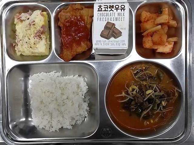 조식 : 쌀밥,사골우거지국,엥그리치킨스테이크,스위스 뢰스티,깍두기,초코우유