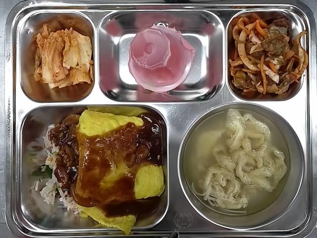 석식 : 게살오므라이스,가시오브시장국,순살왕꼬막야채초무침,배추김치,에이드