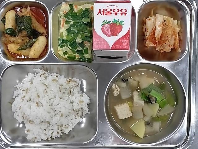 조식 : 귀리밥,우런된장찌개,춘천닭갈비(치즈떡),야채계란찜,배추김치,딸기우유