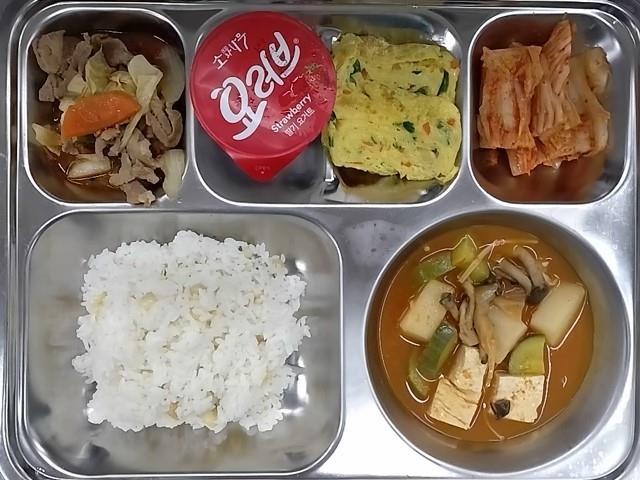 조식 : 찰옥수수밥,호박고추장찌개,돼지불고기,야채계란말이,배추김치,요플레(딸기)