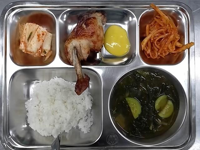 석식 : 쌀밥,건새우아욱된장국,장각닭다리구이+소스,도라지무생채,배추김치