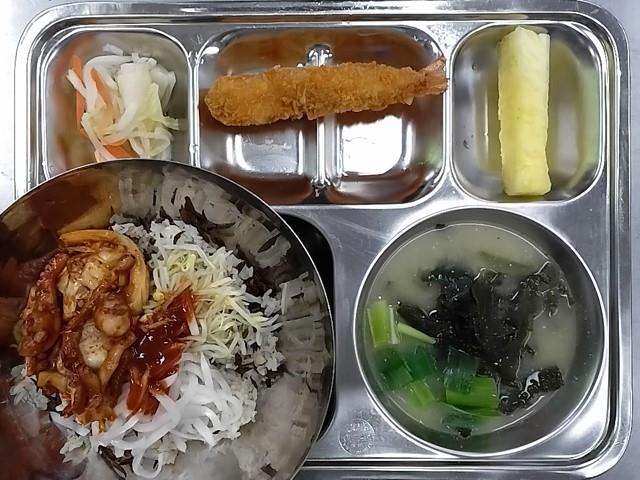 중식 : 낙지야채비빔밥,들깨미역국,왕새우튀김,백김치,파인애플(조각)