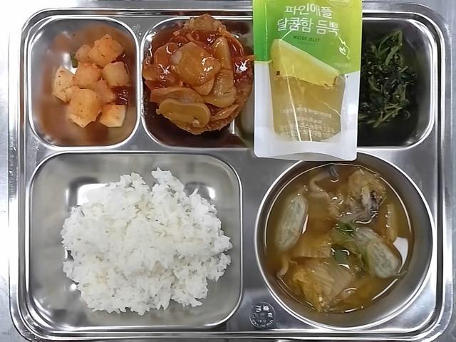 석식 : 발아현미밥,꼬물이만두김칫국,에그토르티아+소스,비름나물무침,깍두기,파인 워터젤리