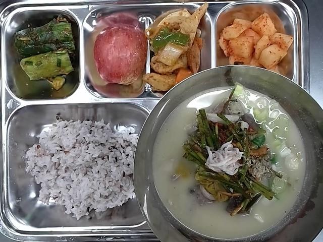 중식 : 혼합잡곡밥,순대국,새송이어묵볶음,오이소박이,부추무침,깍두기,친환경 사과
