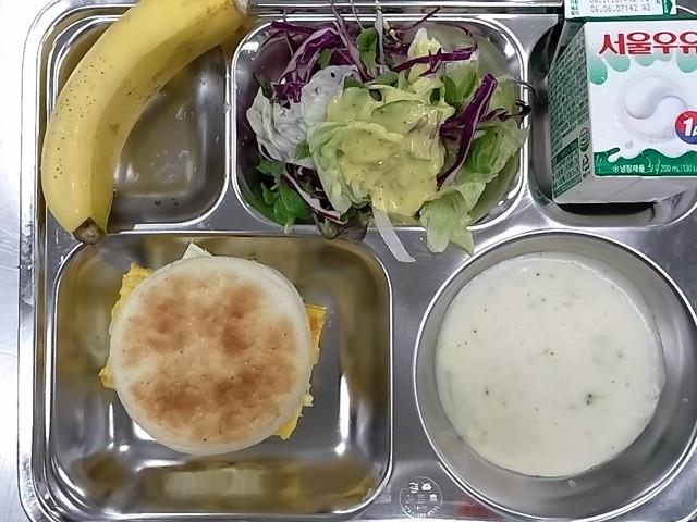 조식 : 잉글리시머핀(셀프),브로콜리크림스프,스팸오믈렛+케찹,참치샐러드,흰우유,바나나