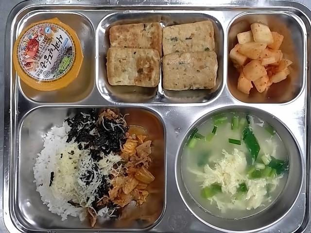 석식 : 돈육김치치즈덮밥,계란실파국,궁중두부선,깍두기,케플주스