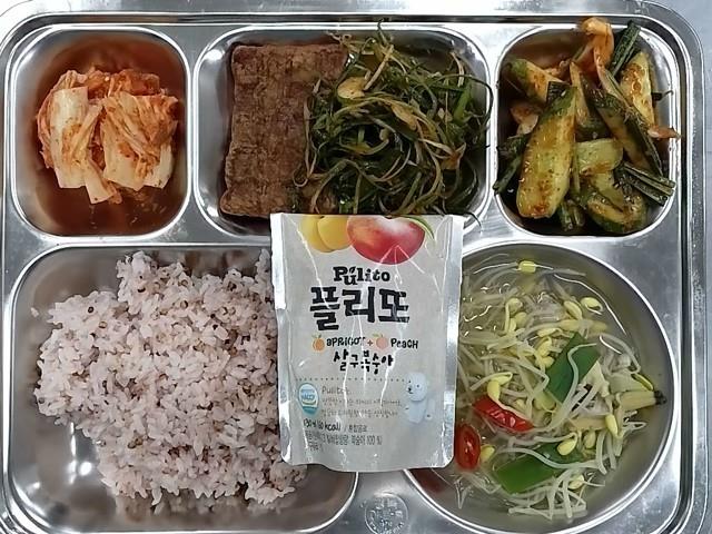조식 : 차수수밥,바지락콩나물국,숯불너비아니구이+파채구이,오이양파무침,배추김치,살구복숭아주스