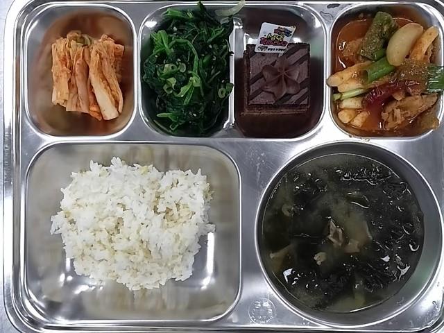 중식 : 기장밥(친),쇠고기미역국,매운돼지갈비찜,시금치나물,배추김치,우리밀 초코케이크