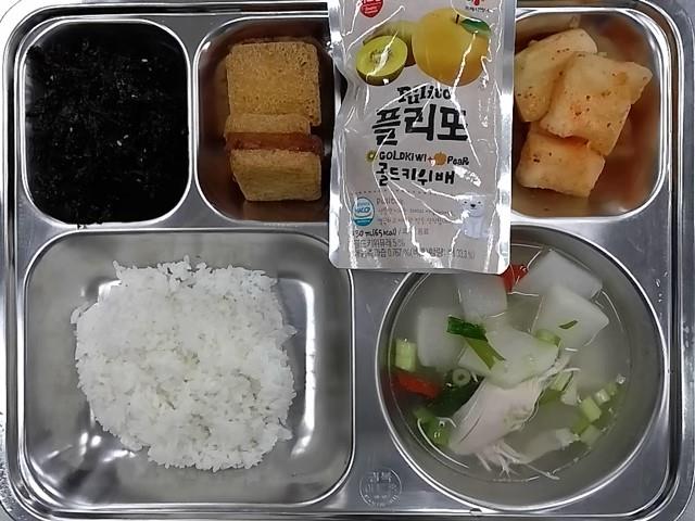 조식 : 쌀밥,닭곰탕,건파래볶음,새우가득멘보샤,석박지,골드키위배주스